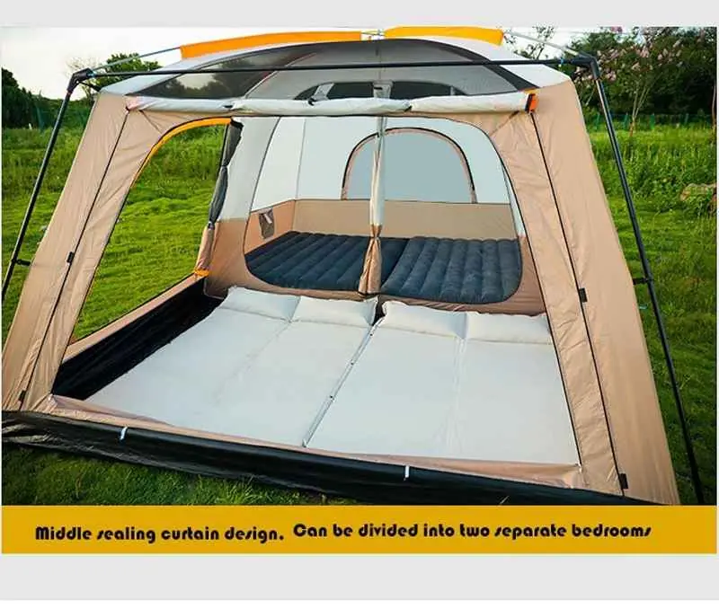 این چادر دارای دو اتاق مجزا است: 1-اتاق خواب: در قسمت پشتی آن قرار دارد و برای استراحت شما طراحی شده است. 2- اتاق نشیمن: در قسمت جلویی واقع شده و مکانی مناسب برای دورهمی و فضای میز و صندلی فراهم میآورد. فضای بین این دو اتاق دارای یک درب هست که از دو طرف به صورت هلالی باز می شود.